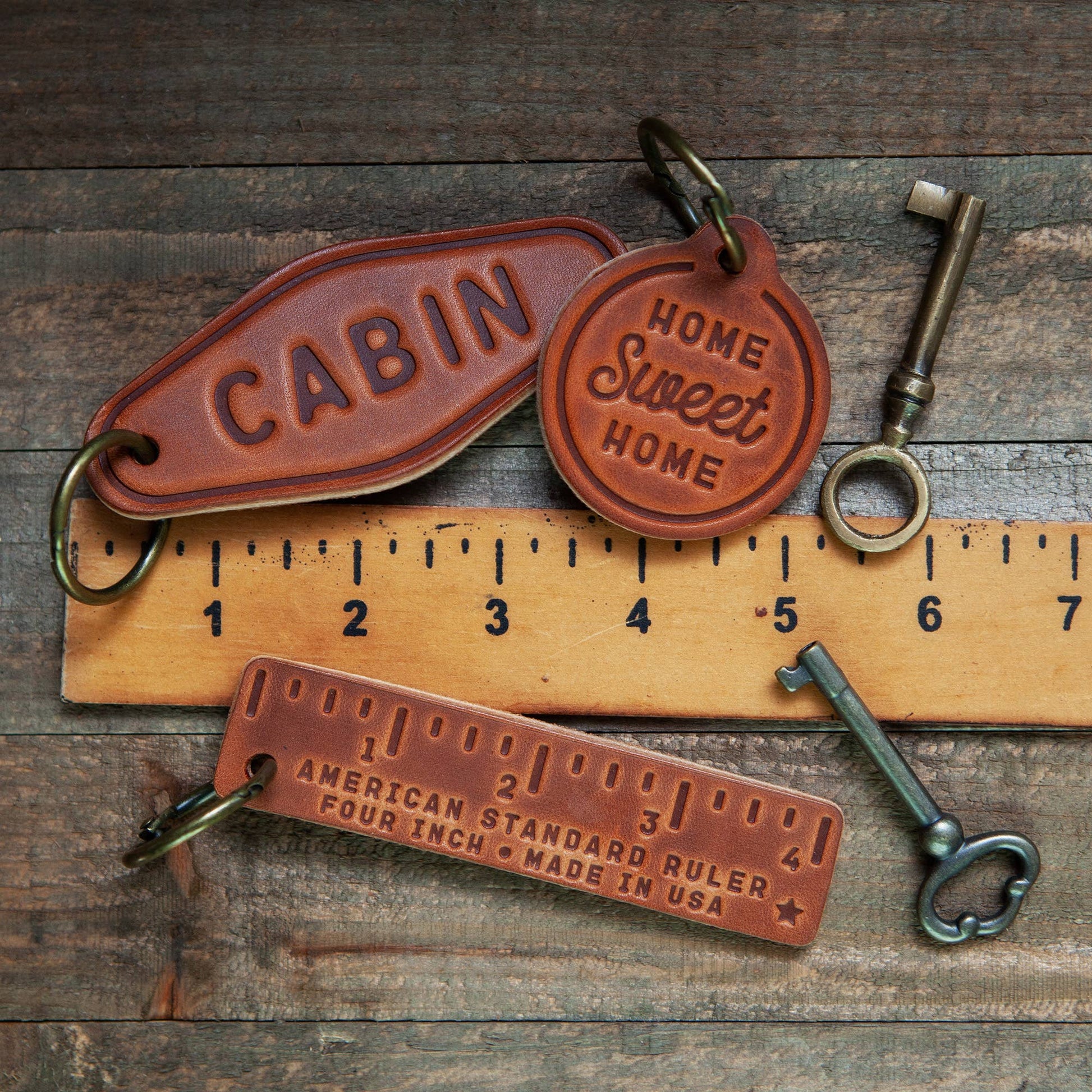 KEYCHAIN SIZE Circle Style 2 inches. Hardware Antique Bronze 1 inch Hinged Keyring SOLID LEATHER KEYCHAIN / KEY FOB Unique and personalized gift item to offer your customers! Our leather keychains are cut and pressed by hand from some of the thickest and finest harness leather available, and patina beautifully as they age. We have many more styles planned for the near future, so check back soon and often! Looking for your state or location? Need custom branding or something special for gift baskets? Reach out today! Note: This listing is for the product in the title and appearing as the primary image. Additional images are for representation of sizes/features only.