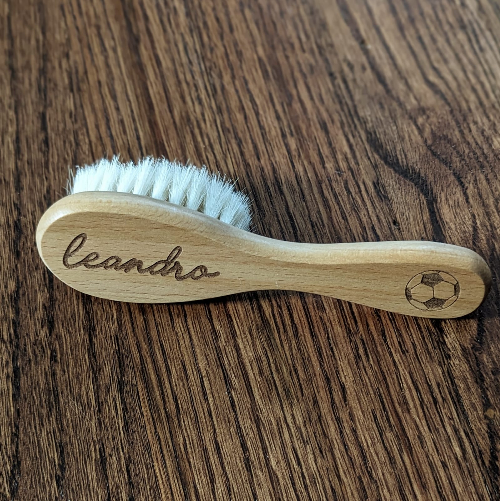 Natural wooden baby hair brush engraved with baby's name. Enough room for two names (first and middle or first and last).