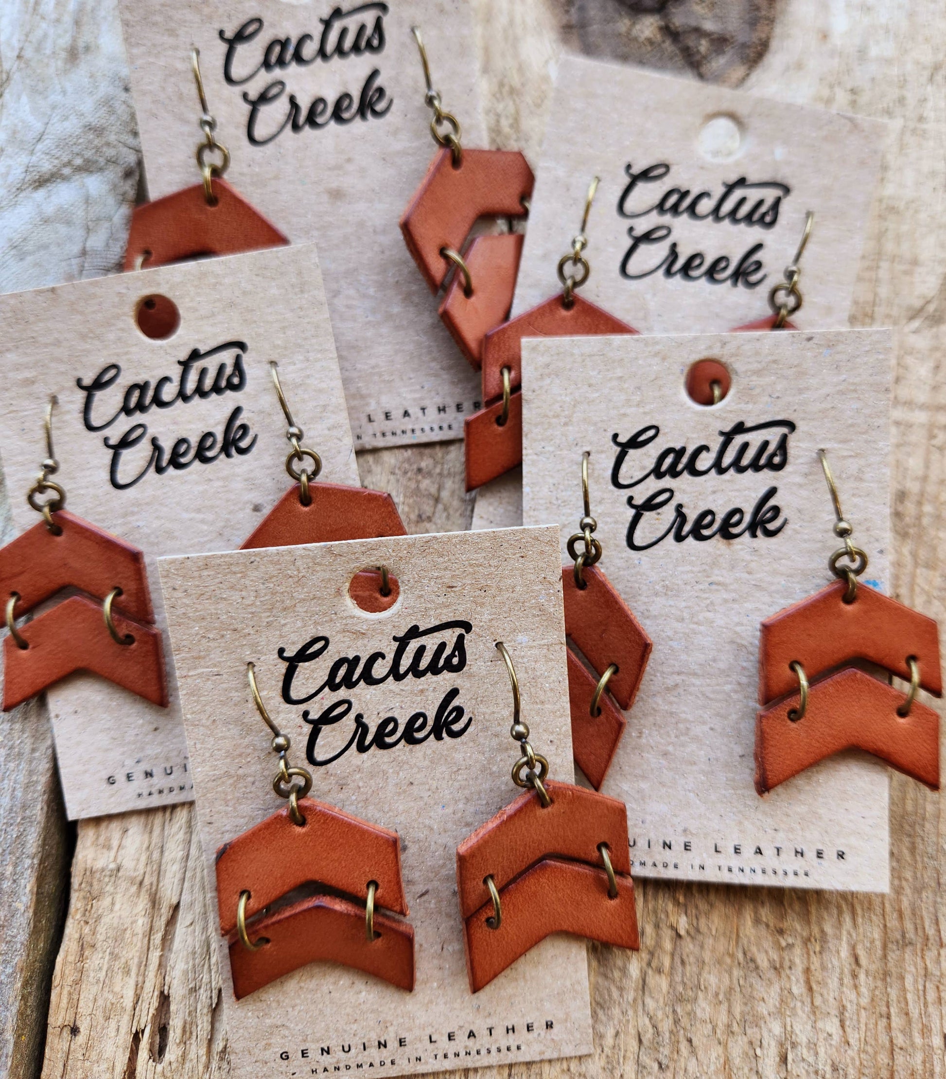 Genuine leather chevron earrings with a distressed western look. Back of leather is finished, rings and ear hooks are antique copper. Handmade in Tennessee.