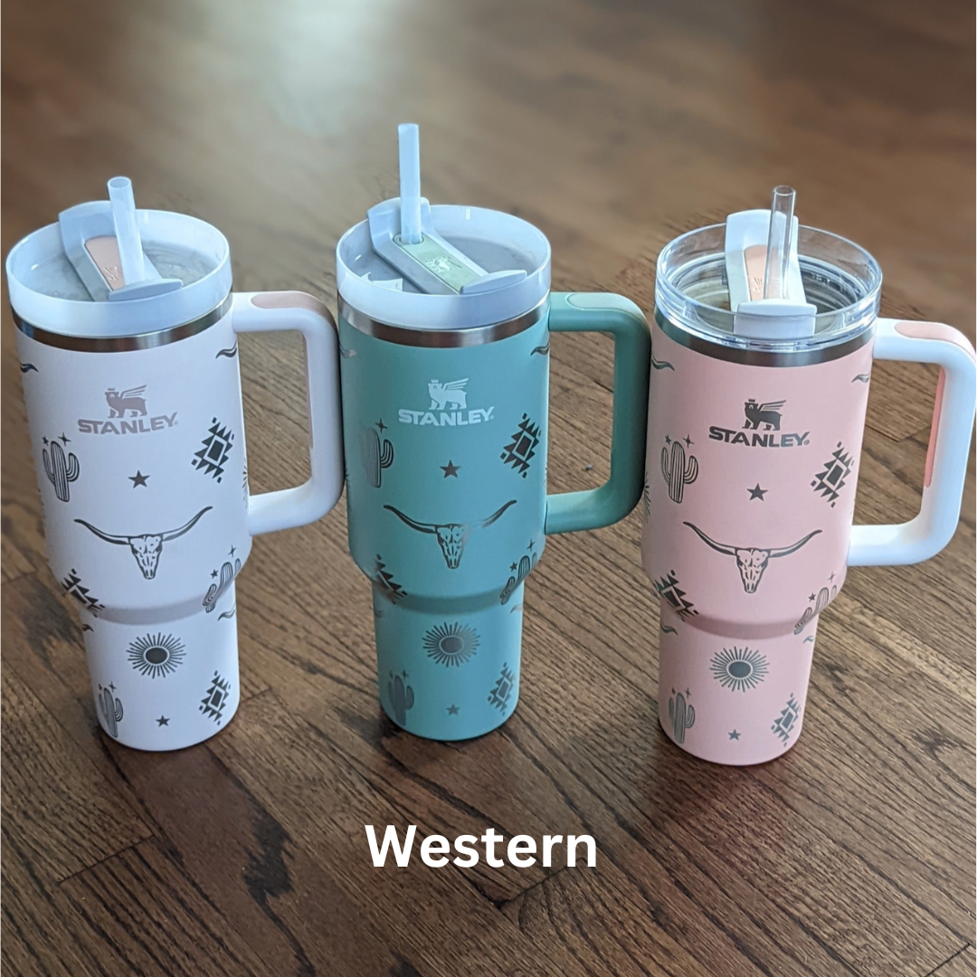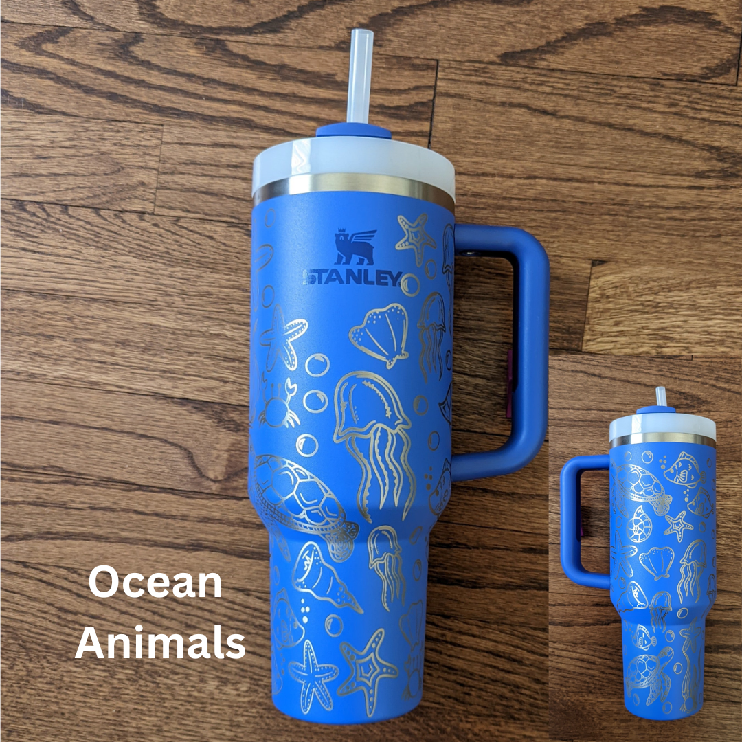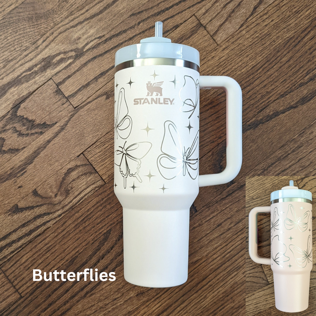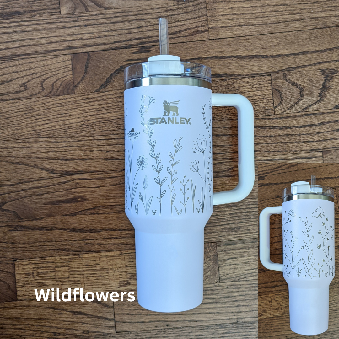 Laser engraved Stanley 40oz Quencher H2.0 Tumbler with design wrapping around the tumbler.