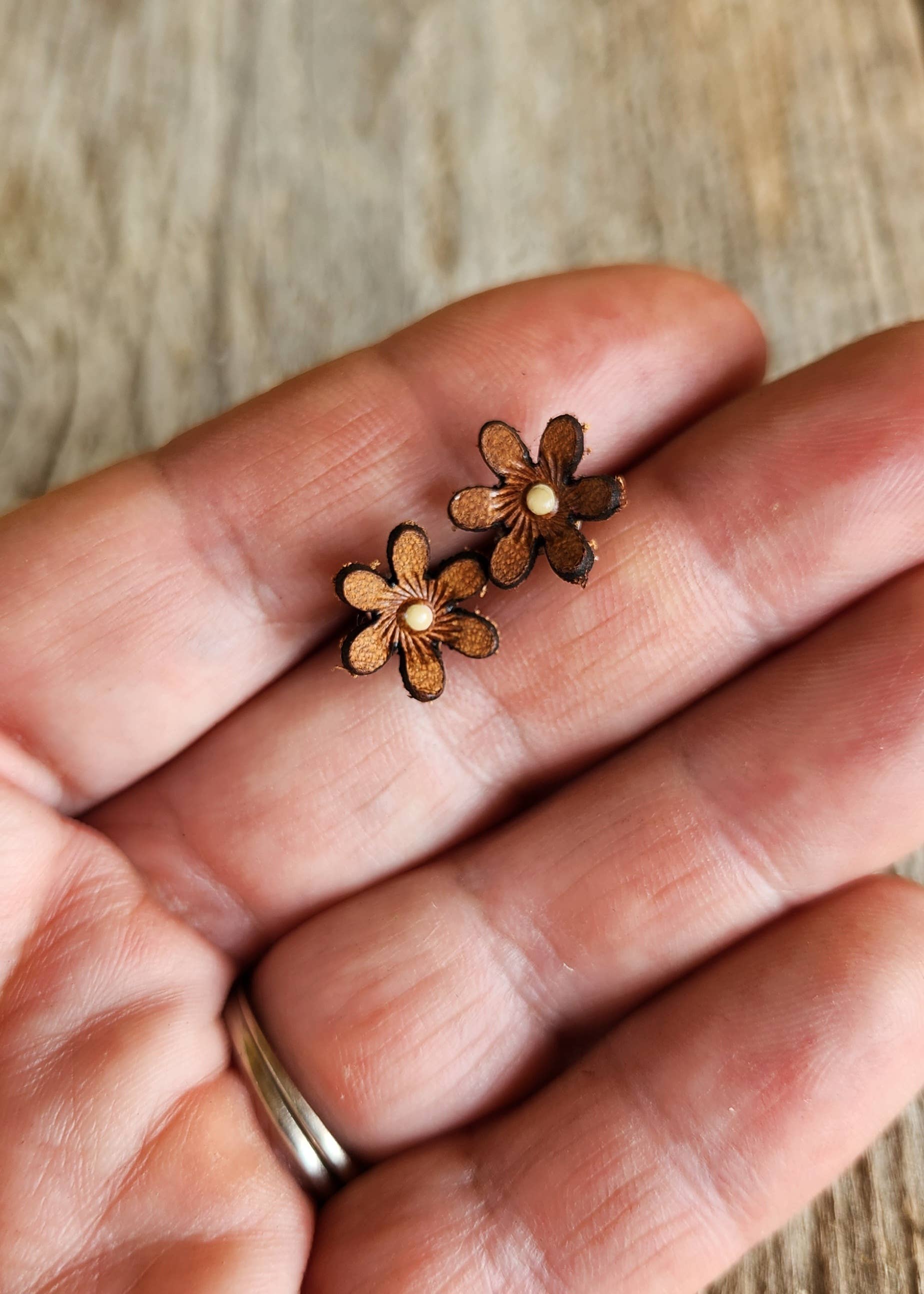 Cute western stud earrings with a vintage western look. Hand stamped and painted on genuine leather. Stainless steel posts. Comes displayed as a field of wildflowers on card. These were always a best seller at my craft shows.